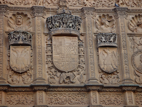 El segundo piso de la fachada de la Universidad de Salamanca está decorado con motivos heráldicos: a la izquierda el águila bicéfala de la Casa de Habsburgo, en el centro el escudo de Carlos V y a la derecha el águila de san Juan, símbolo de España desde los primeros tiempos de la Reconquista.